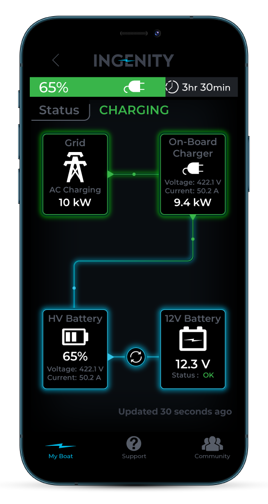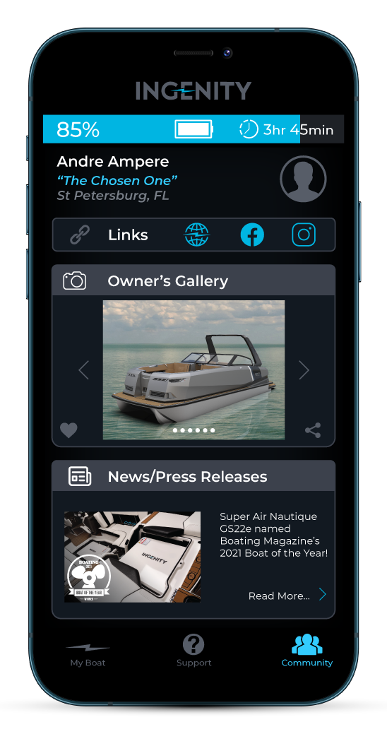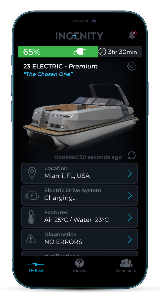 In addition to the physical vessel design, our collaboration on 23 Electric extended through to the design of the graphic user interface for operating the vessel via the helm's touchscreen display as well as by providing complimentary graphic design for the "Ingenity Connect "App. We set out to flatten the learning curve for electric boating by creating a simple and approachable user interface with unparalleled connectivity.