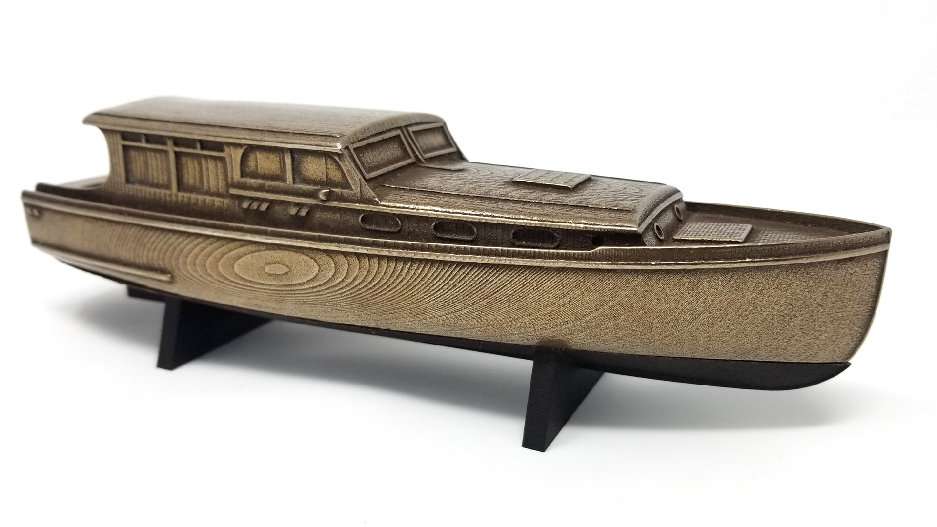 Reverse-engineered and 3D modeled a classic 1939 Elco Cruisette 39. 3D printed a scale model in steel/bronze via binder jetting process. Scale model measures 8" long in polished bronze finish.