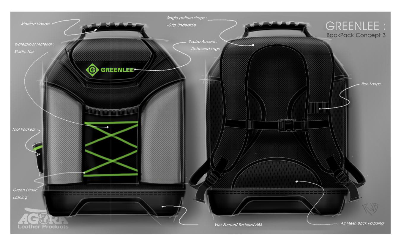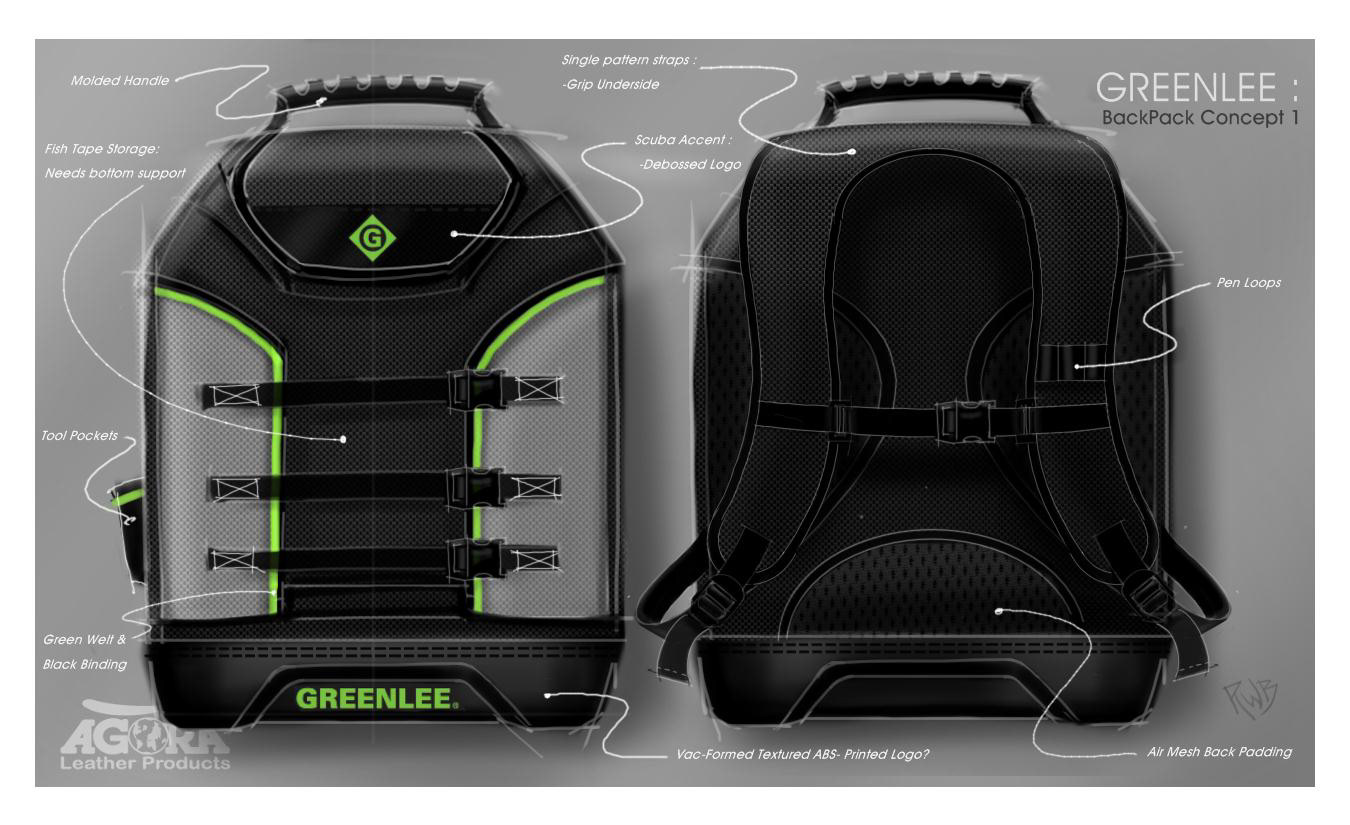 Concept sketches for a tool-carrying backpack created for a custom-softgoods manufacturer. Guided the project from concept inception to production-ready prototype